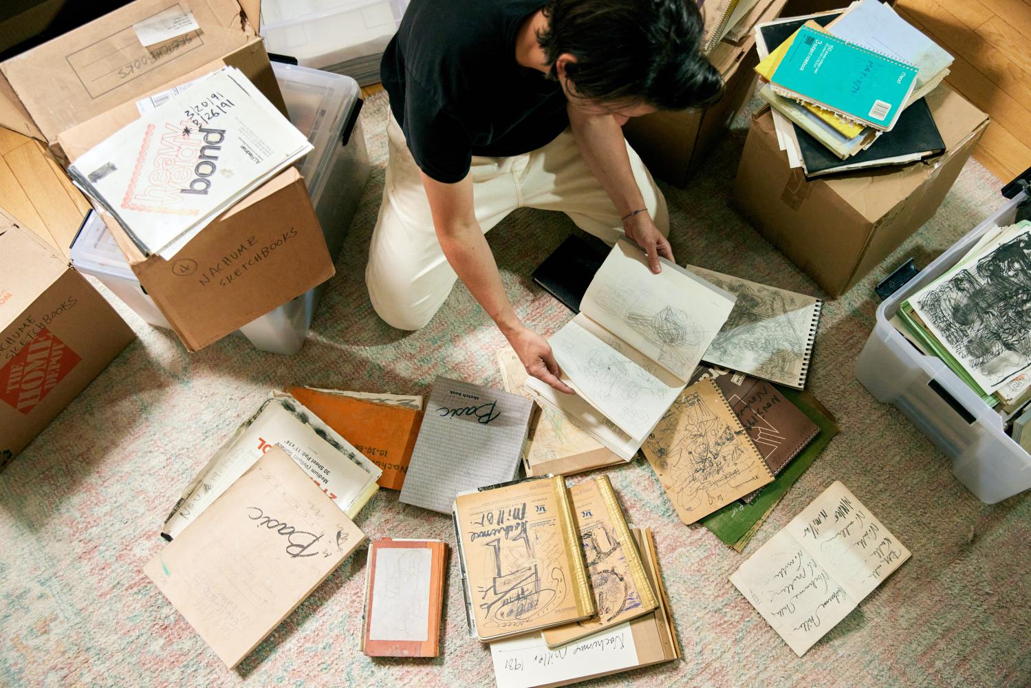 Drei Monate lang blätterte er aus Angst, den Schwung zu verlieren, zwischen den Seiten der Skizzen durch Überbleibsel des Lebens – Visitenkarten, chinesische Imbisskarten, To-Do-Listen.
